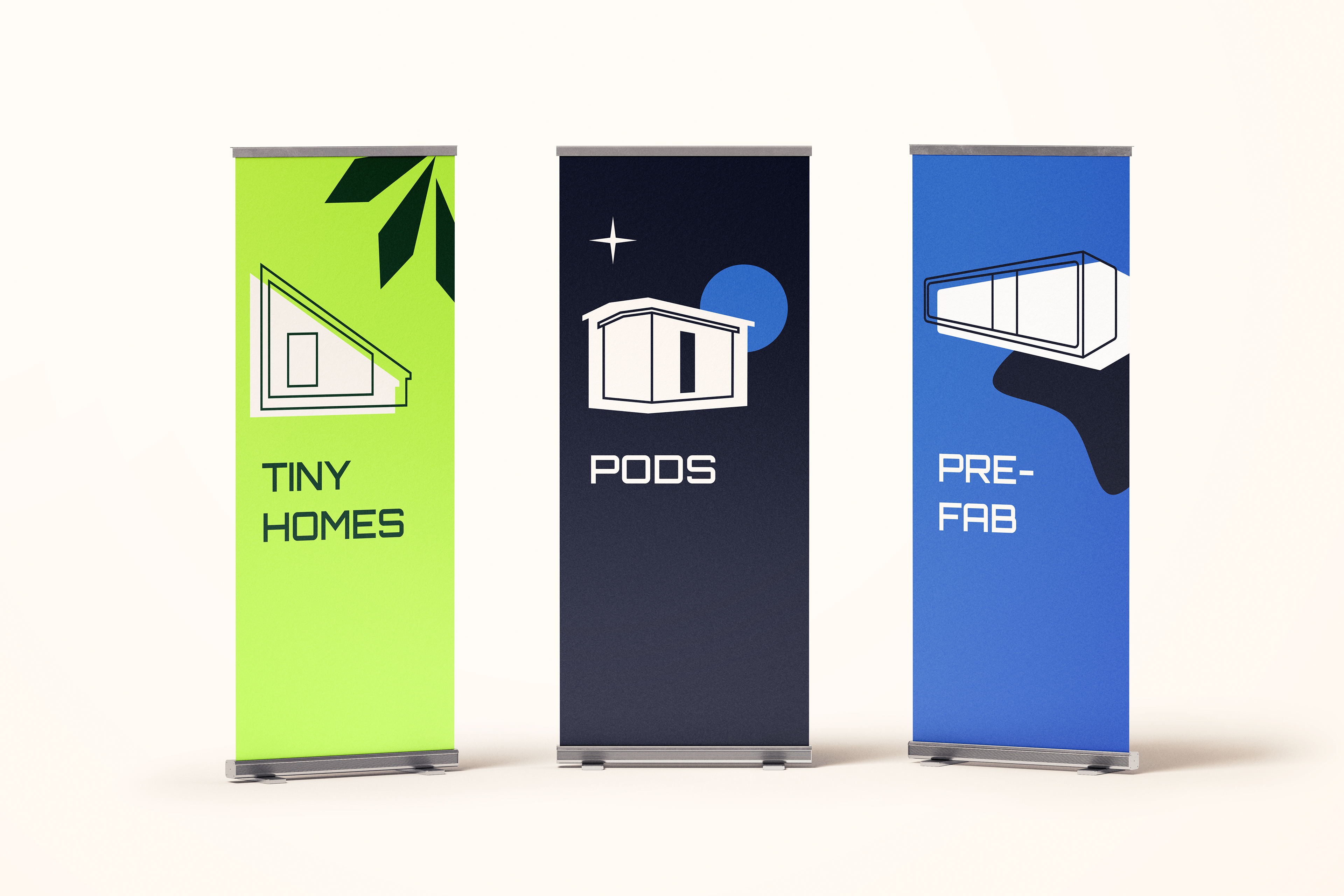 This is achieved primarily through the use of bright colors, a friendly and accessible typeface, as well as a 'blending' of architectural and nature graphics. Both categories of graphics are crafted using angular shapes, and may be filled, outlined, or masked for emphasis or added interest. The consistency of the angular shape across categories, mixed with the interchangeability of these stylistic effects hints at a symbiosis, a funky kind of harmony between housing and nature.
